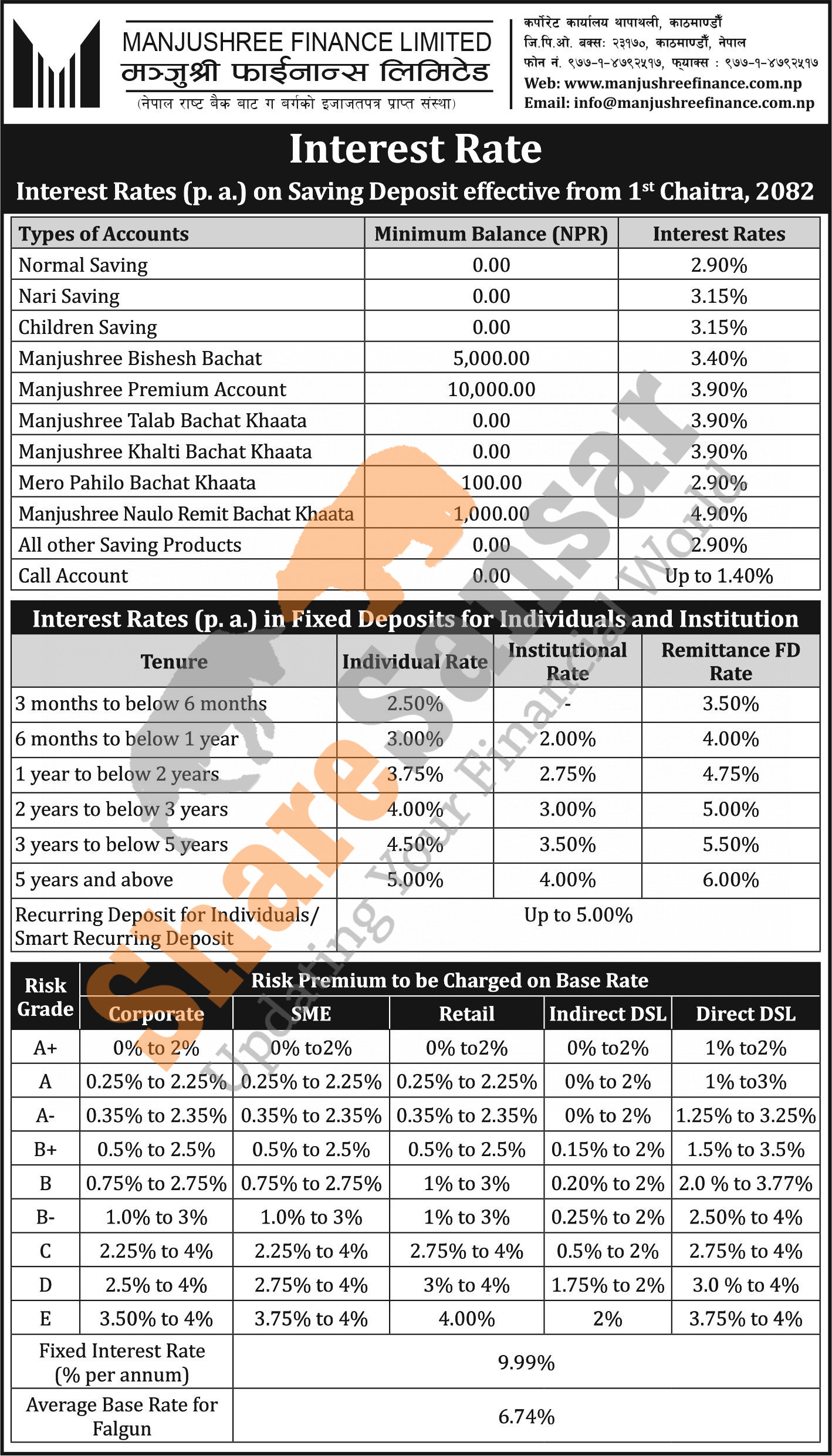 Manjushree Finance Limited has published a notice regarding the new interest rate for deposit and loan products and it's effective from 1st Chaitra, 2082.