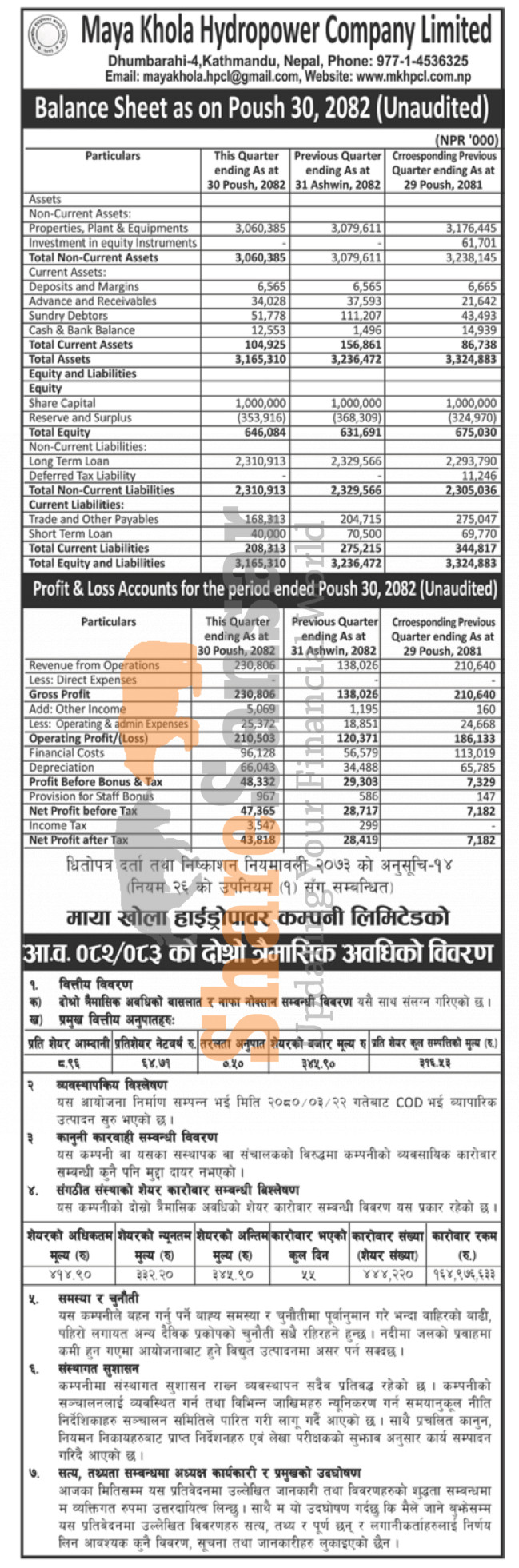 Maya Khola Hydropower Company Limited has posted a net profit of Rs 43.81 million and published its 2nd quarter company analysis of the fiscal year 2082/83.