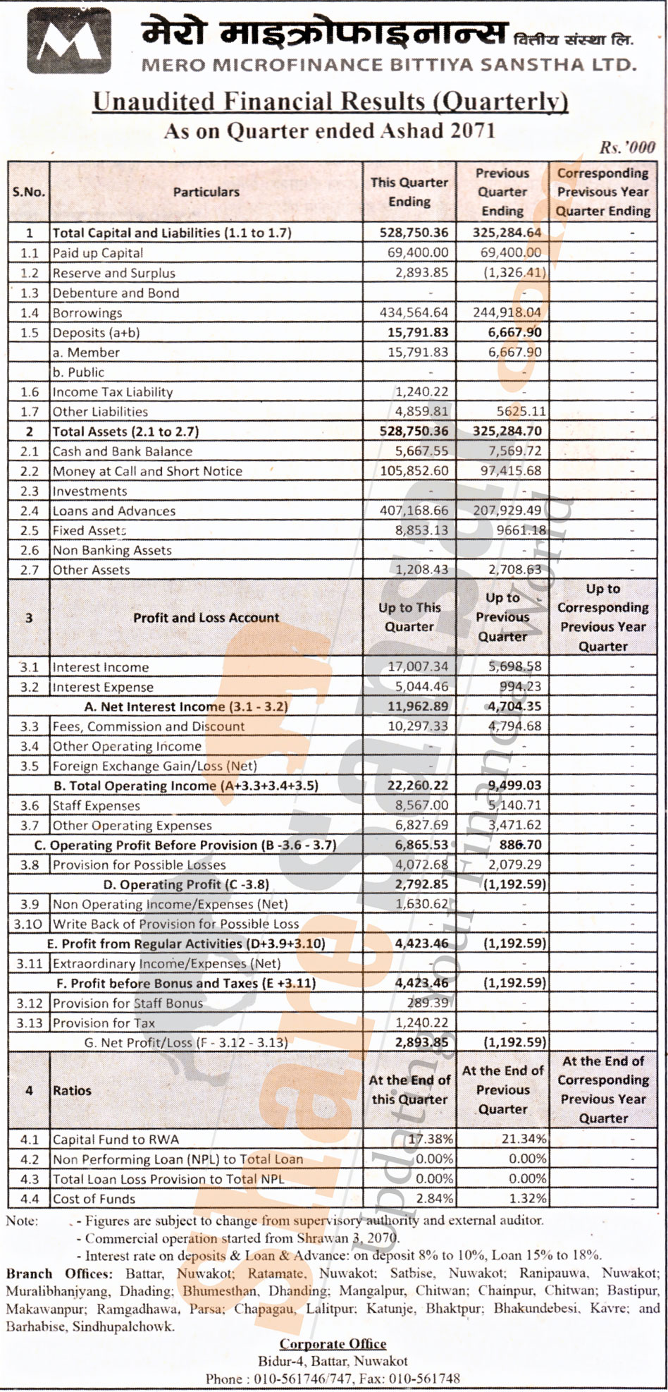 Mero Microfinance Bittiya Sanstha Limited has posted net profit of Rs 2.89 million during the 4th quarter of the fiscal year 2070/71.