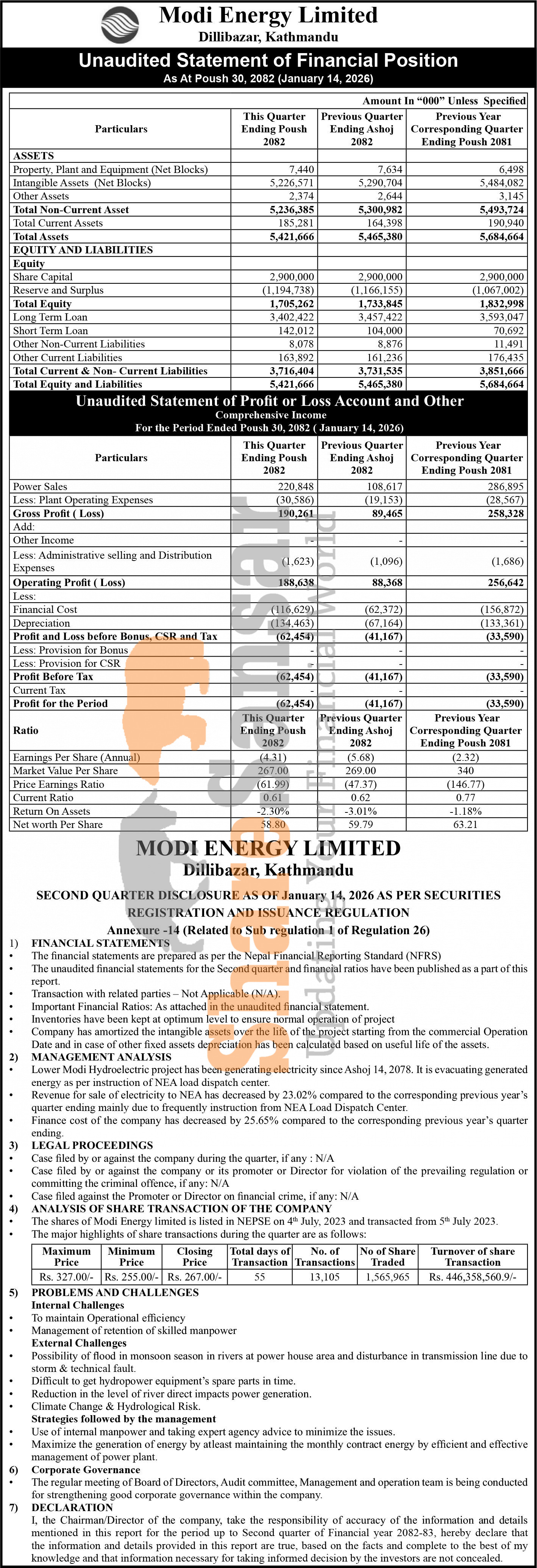 Modi Energy Limited has posted a net loss of Rs 62.45 million and published its 2nd quarter company analysis of the fiscal year 2082/83.