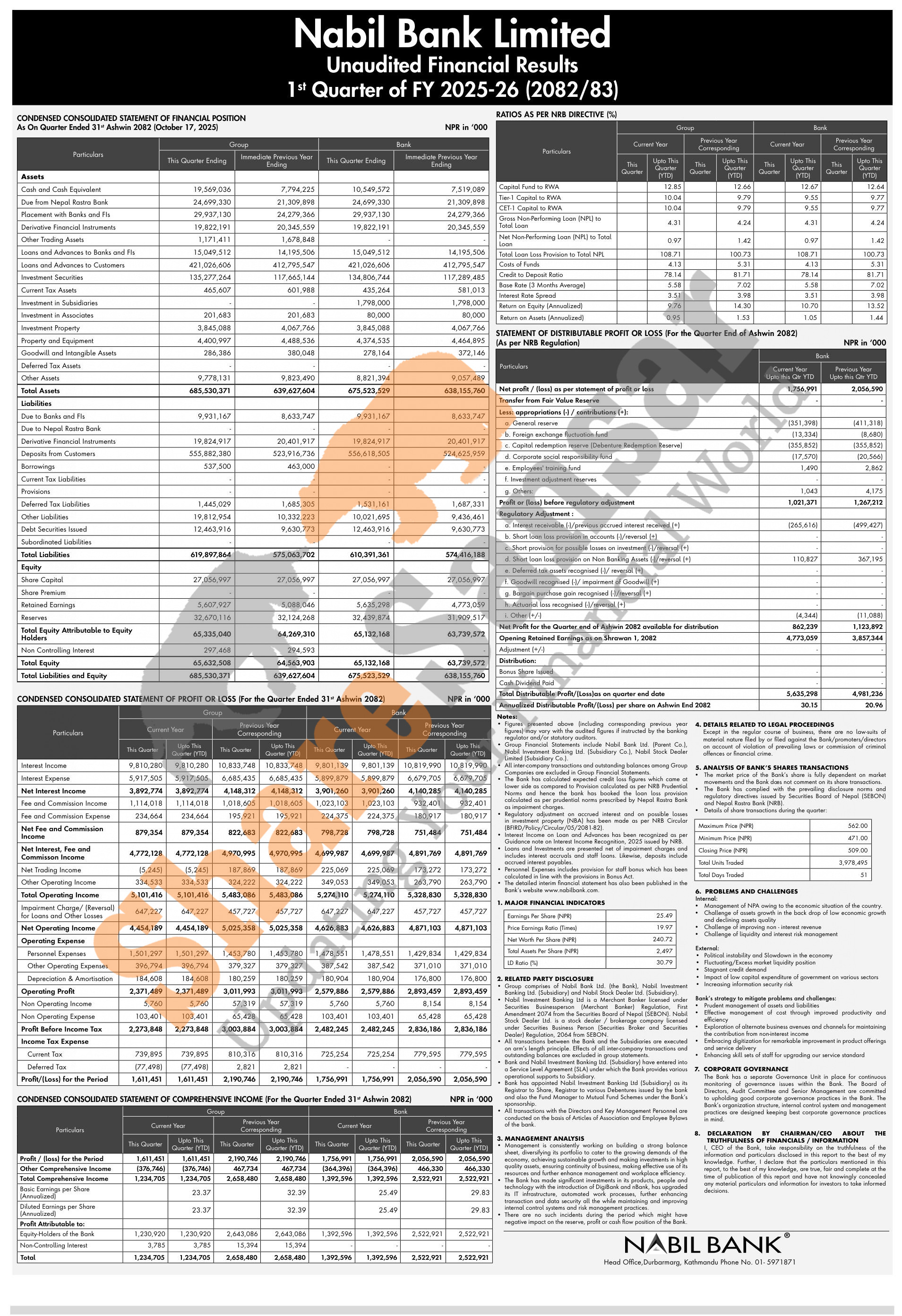 Nabil Bank Limited has posted a net profit of Rs 1.75 billion and published its 1st quarter company analysis of the fiscal year 2082/83.