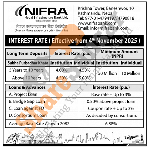 Nepal Infrastructure Bank Limited has published a notice regarding the new interest rate for deposit and loan products and it's effective from today (18th Kartik, 2082).