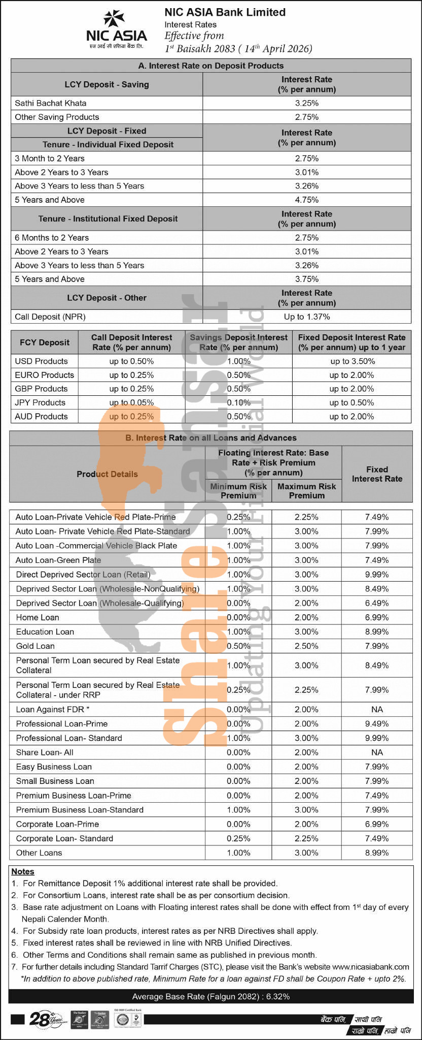 NIC Asia Bank Limited has published a notice regarding the new interest rate for deposit and loan products and it's effective from 1st Baisakh, 2083.