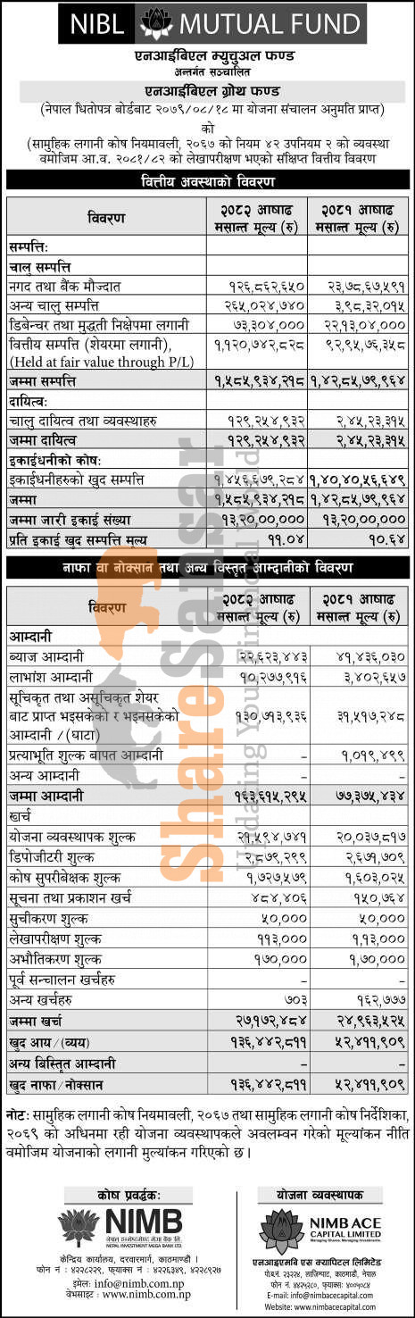 NIMB Ace Capital Limited has published the audited financial highlights of "NIBL Growth Fund" of the fiscal year 2081/82.