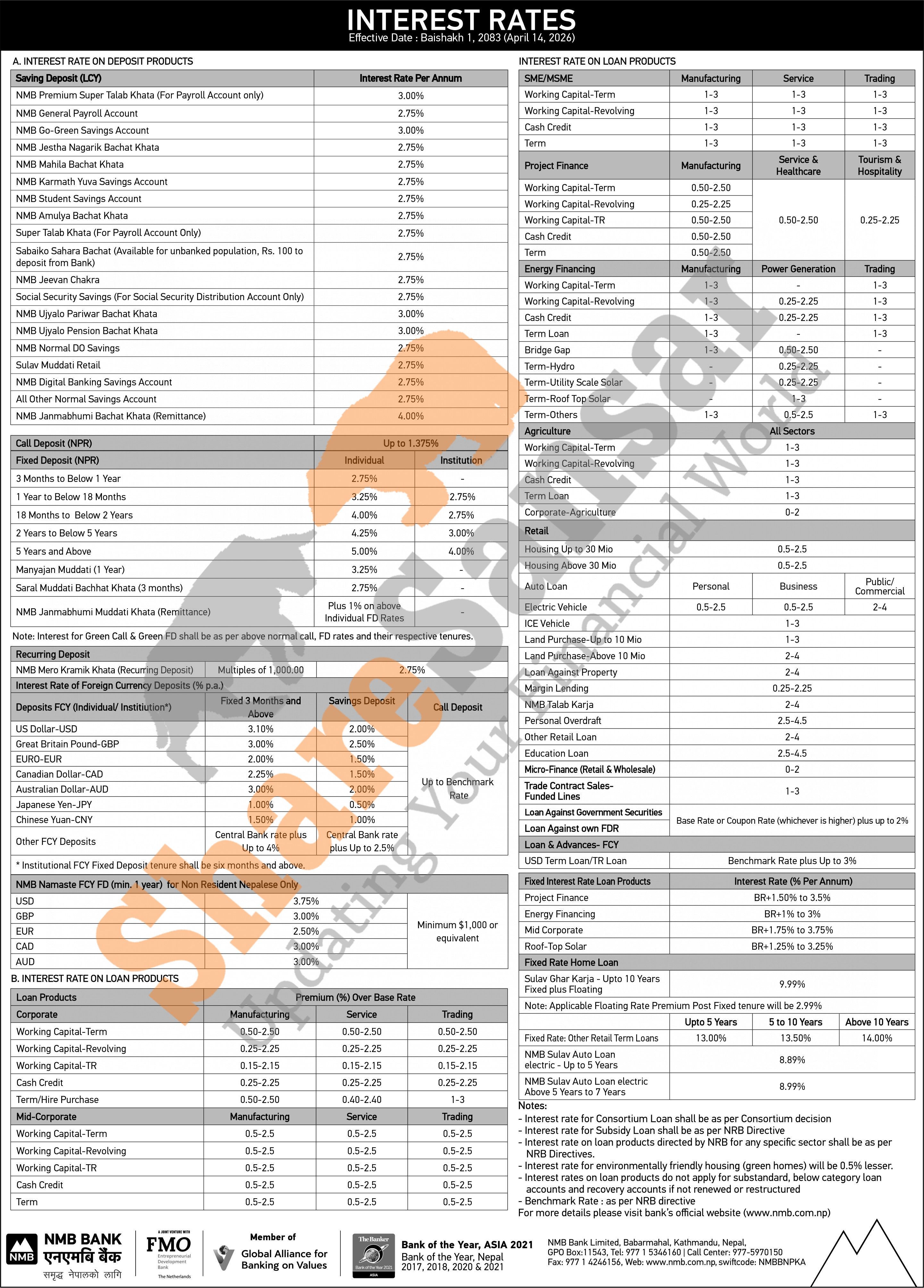 NMB Bank Limited has published a notice regarding the new interest rate for deposit and loan products and it's effective from 1st Baisakh, 2083.
