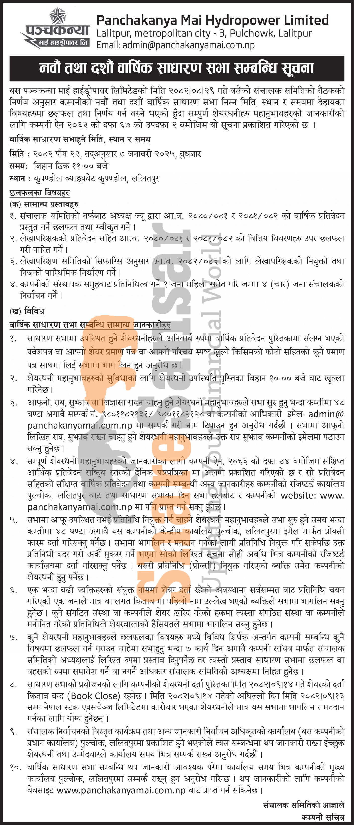 Panchakanya Mai Hydropower Limited has announced its 9th & 10th AGM going to be held on 23rd Poush, 2082.