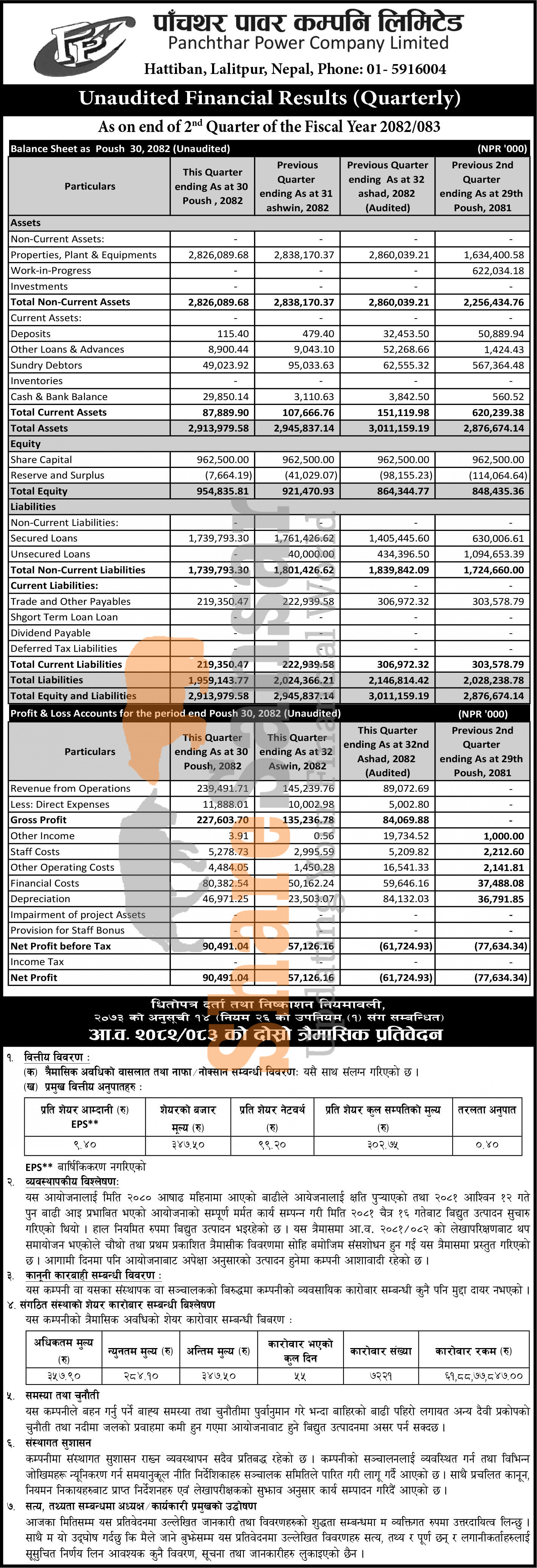 Panchthar Power Company Limited has posted a net profit of Rs 90.49 million and published its 2nd quarter company analysis of the fiscal year 2082/83.
