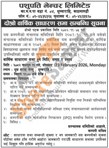 Pashupati Venture Limited has announced its 2nd AGM going to be held on 11th Falgun, 2082.