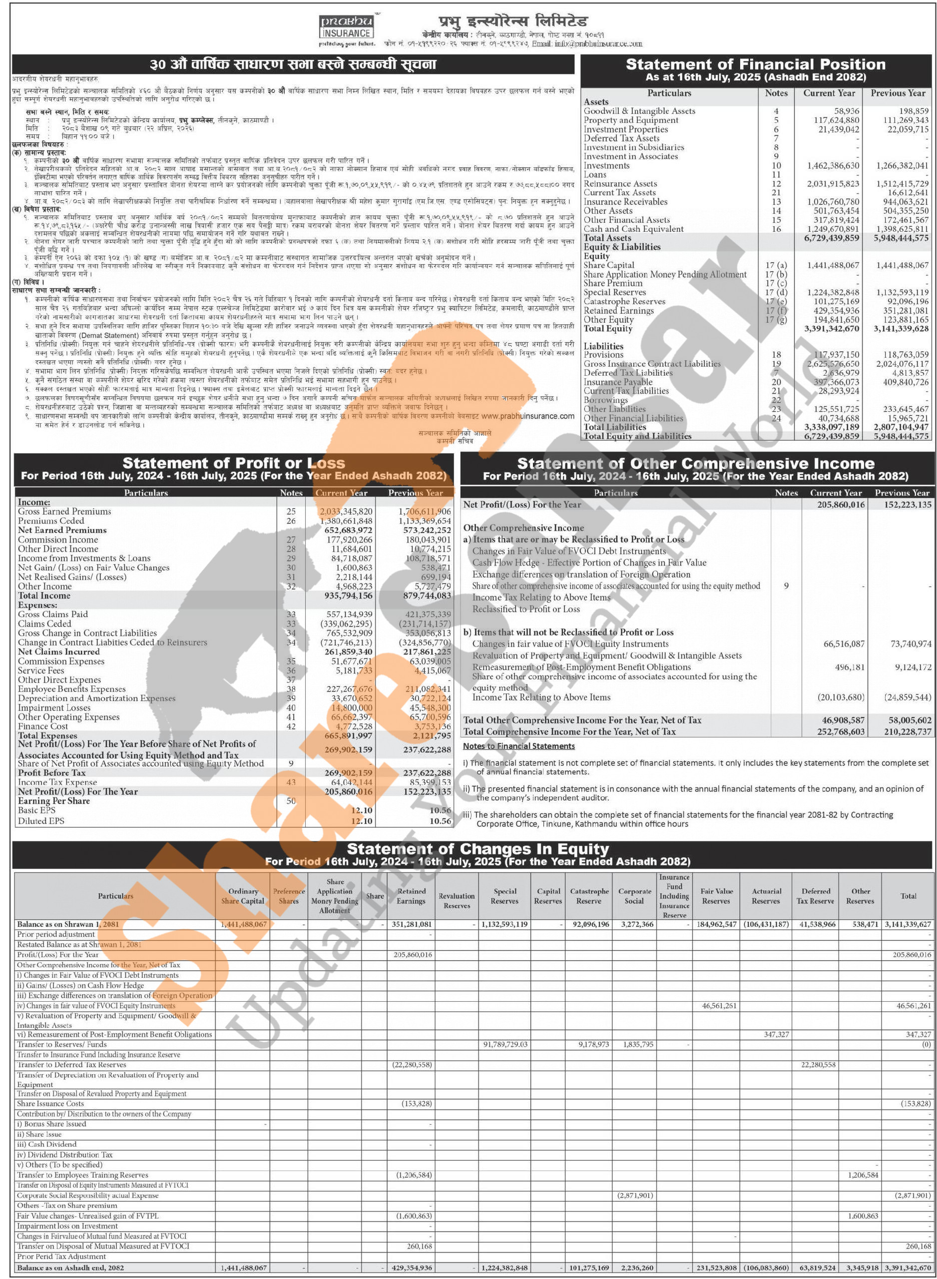 Prabhu Insurance Company Limited has announced its 30th AGM going to be held on 9th Baisakh, 2083 and published its annual financial statement of the fiscal year 2081/82.