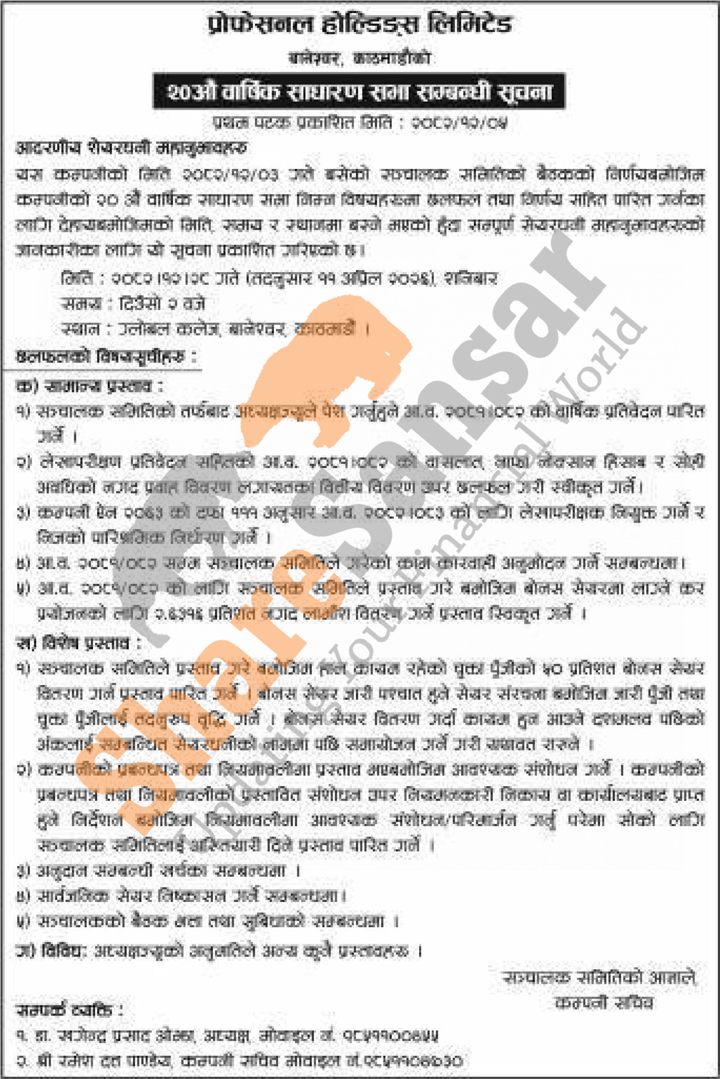 Professional Holdings Limited has announced its 20th AGM going to be held on 28th Chaitra, 2082.