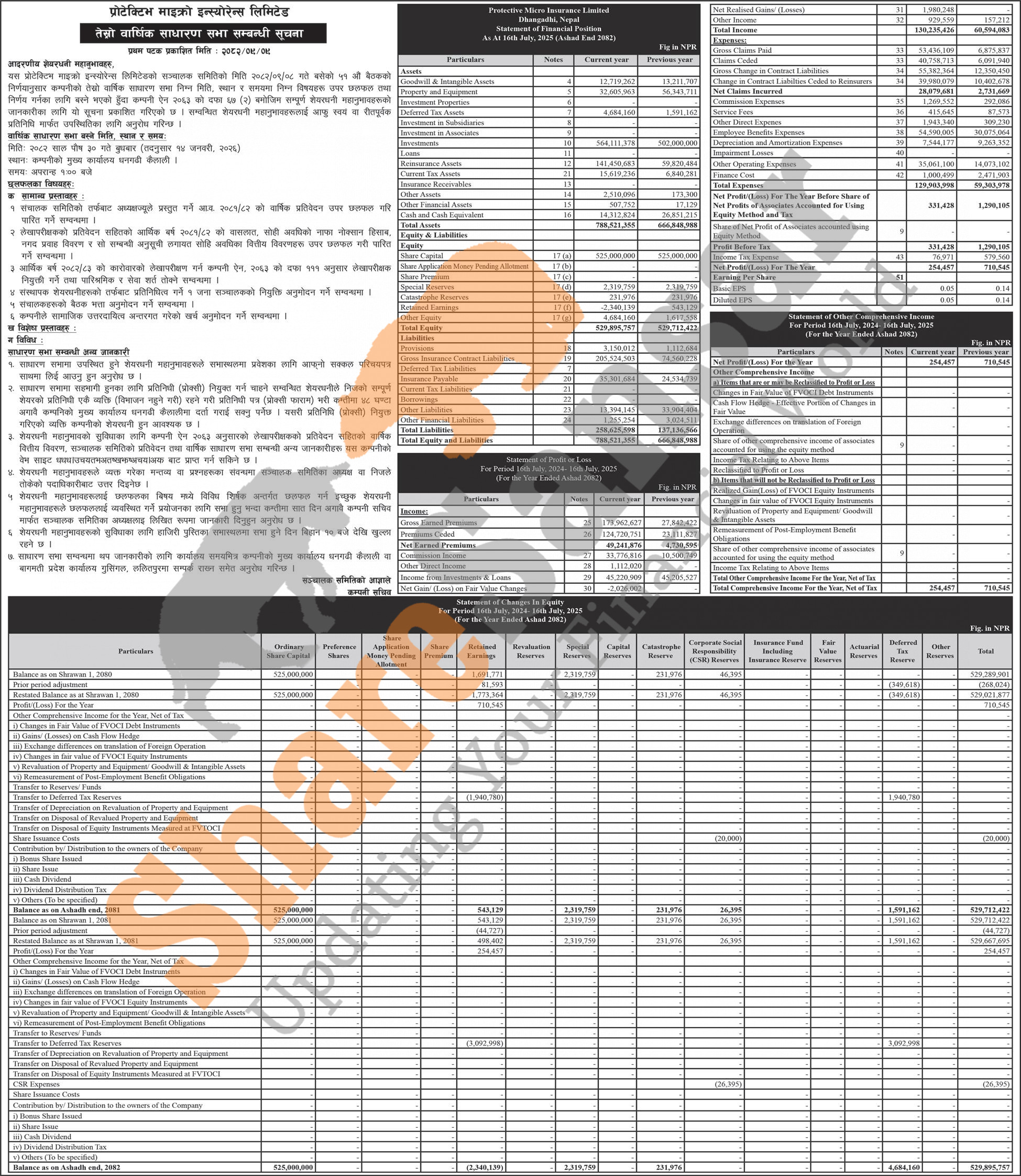 Protective Micro Insurance Limited has announced its 3rd AGM going to be held on 30th Poush, 2082 and has published its annual financial highlights of the fiscal year 2081/82.