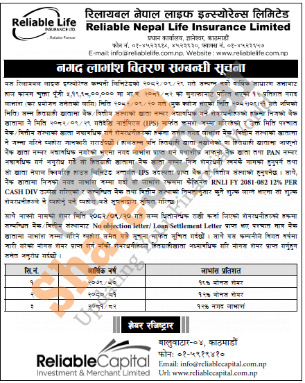 Reliable Nepal Life Insurance Limited has distributed 12% cash dividend directly to bank accounts of its shareholders.