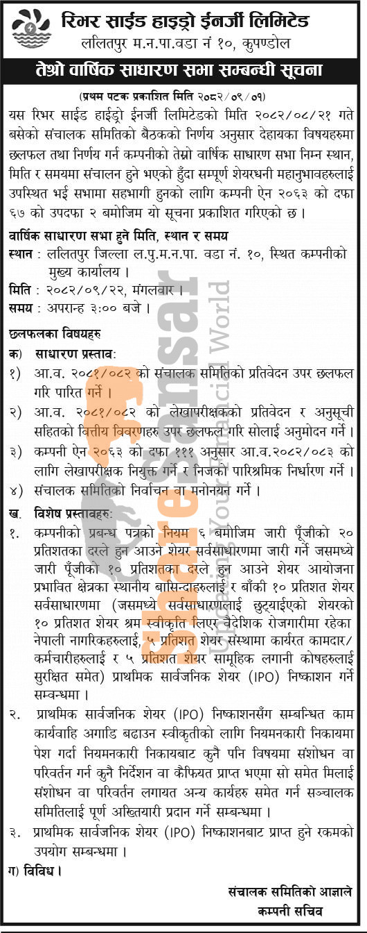 River Side Hydro Energy Limited has announced its 3rd AGM going to be held on 22nd Poush, 2082.