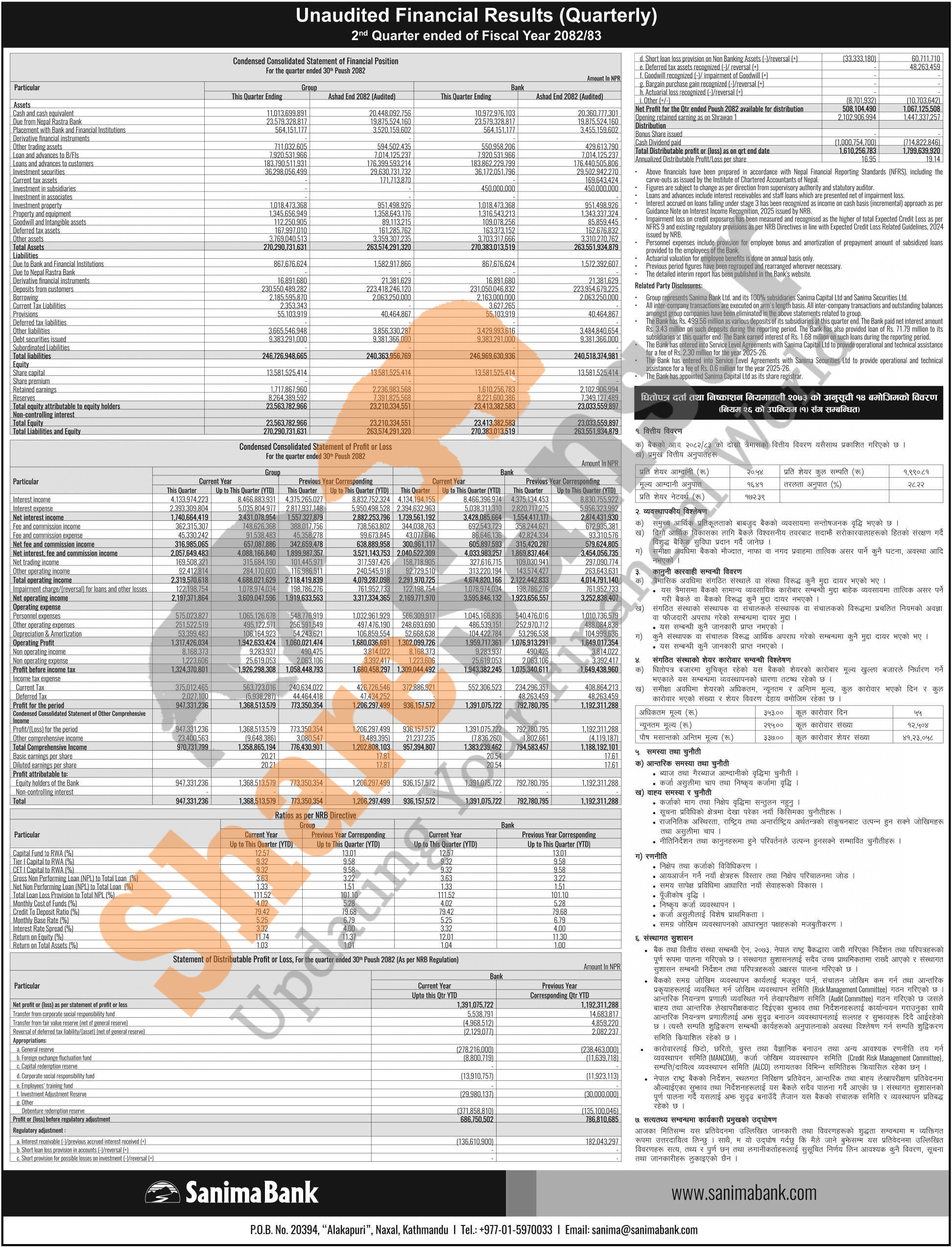 Sanima Bank Limited has posted a net profit of Rs 1.39 billion and published its 2nd quarter company analysis of the fiscal year 2082/83.