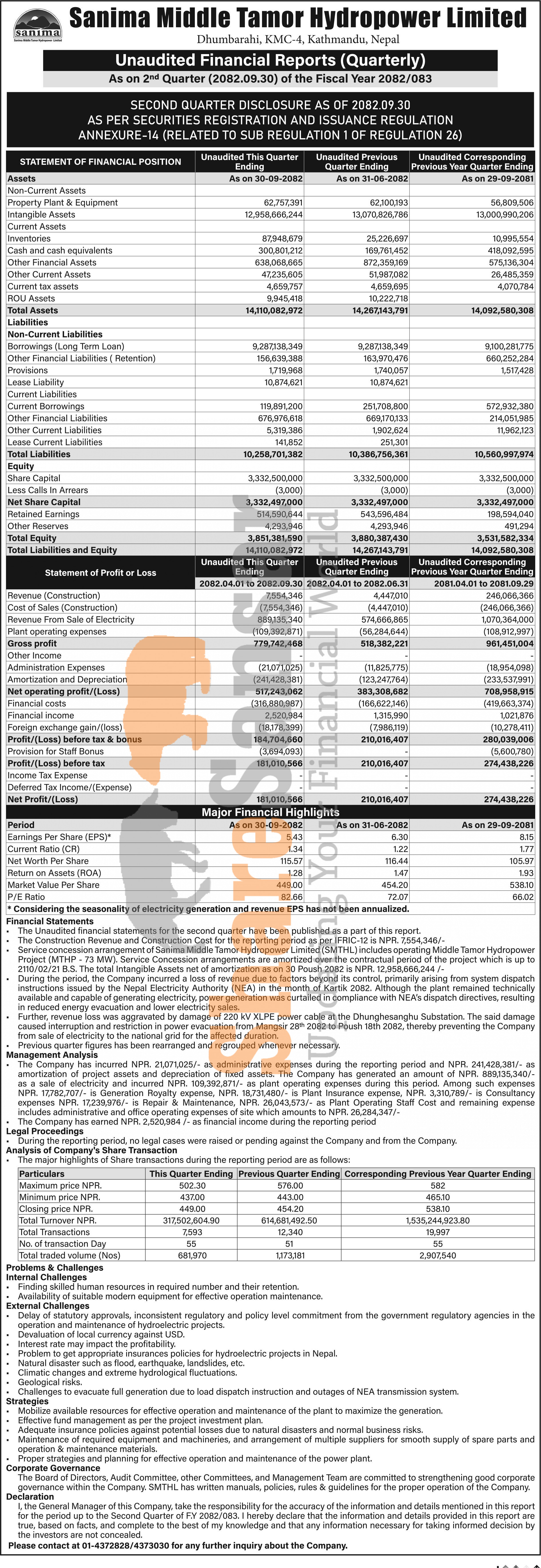 Sanima Middle Tamor Hydropower Limited has posted a net profit of Rs 181.01 million and published its 2nd quarter company analysis of the fiscal year 2082/83.