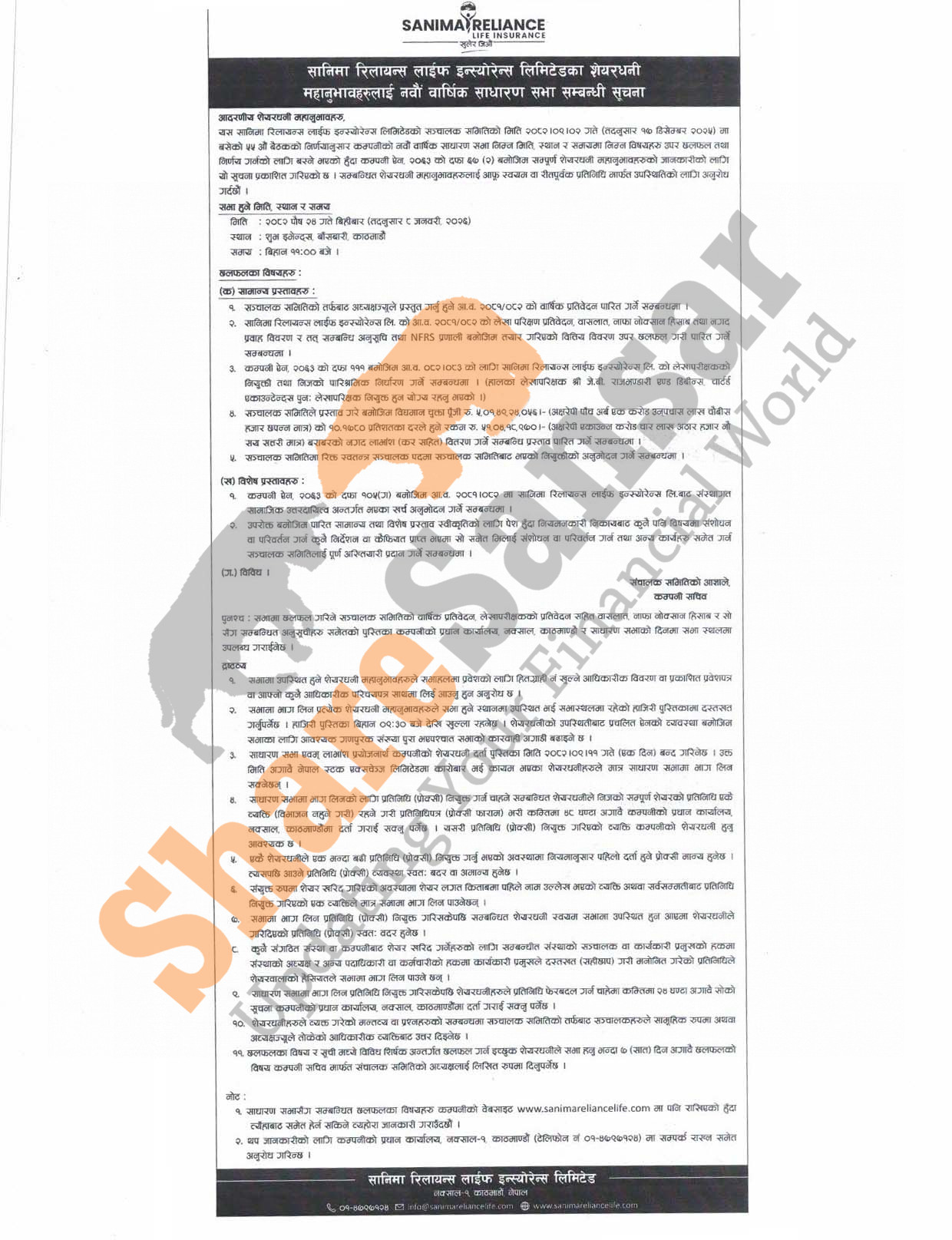 Sanima Reliance Life Insurance Limited has announced its 9th AGM going to be held on 24th Poush, 2082.
