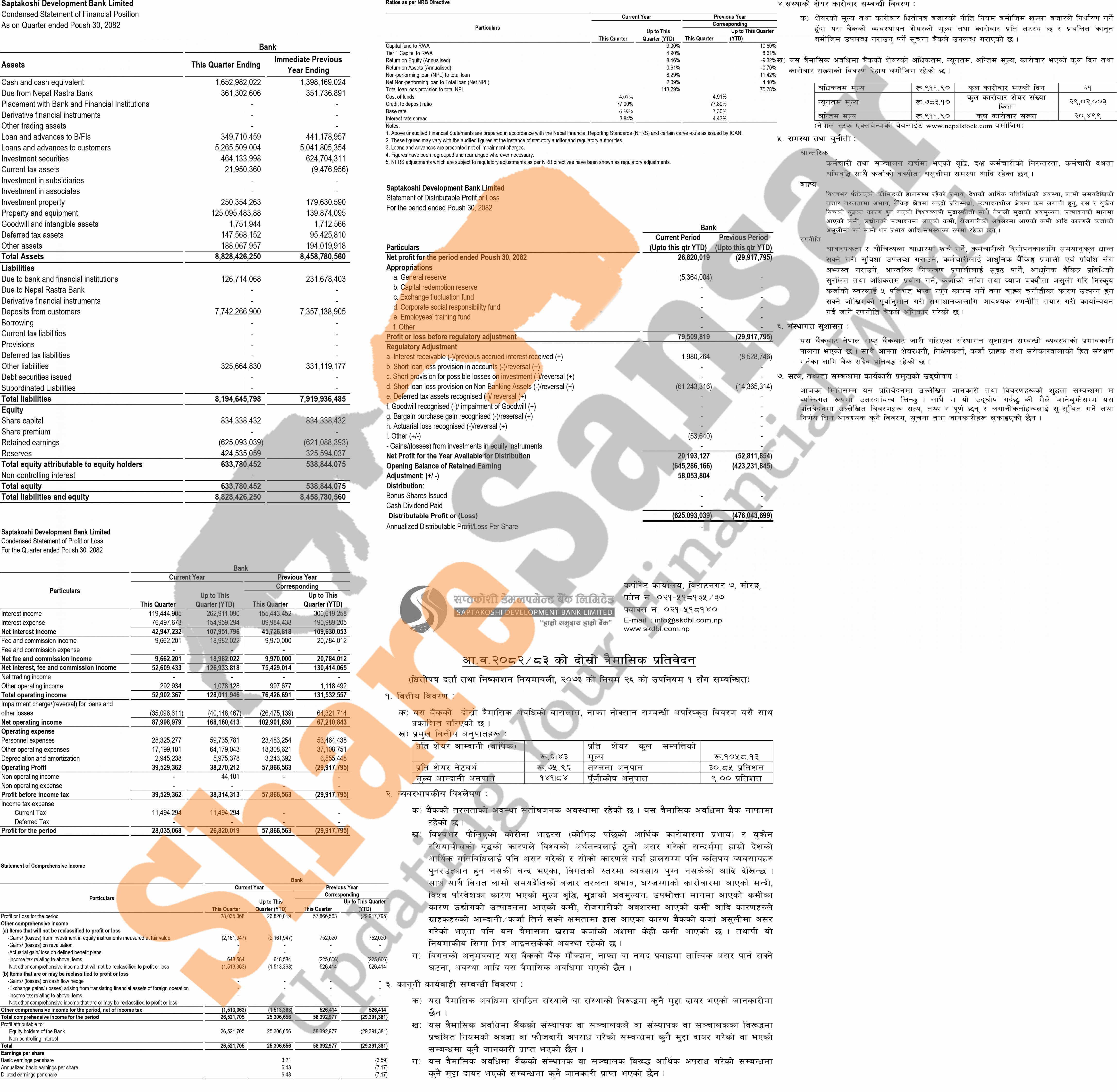Saptakoshi Development Bank Limited has posted a net profit of Rs 26.82 million and published its 2nd quarter company analysis of the fiscal year 2082/83.