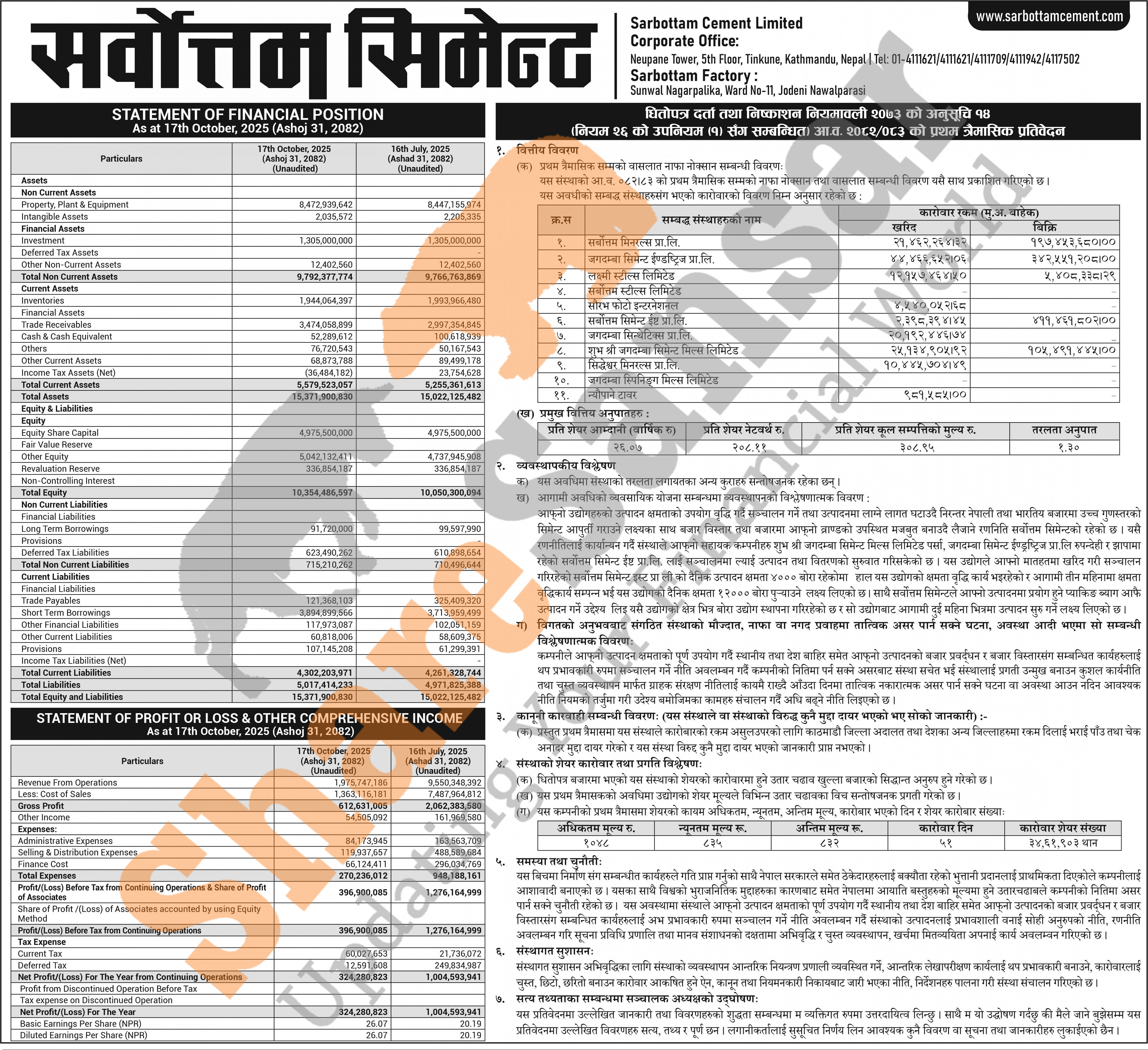 Sarbottam Cement Limited has posted a net profit of Rs 324.28 million and published its 1st quarter company analysis of the fiscal year 2082/83.