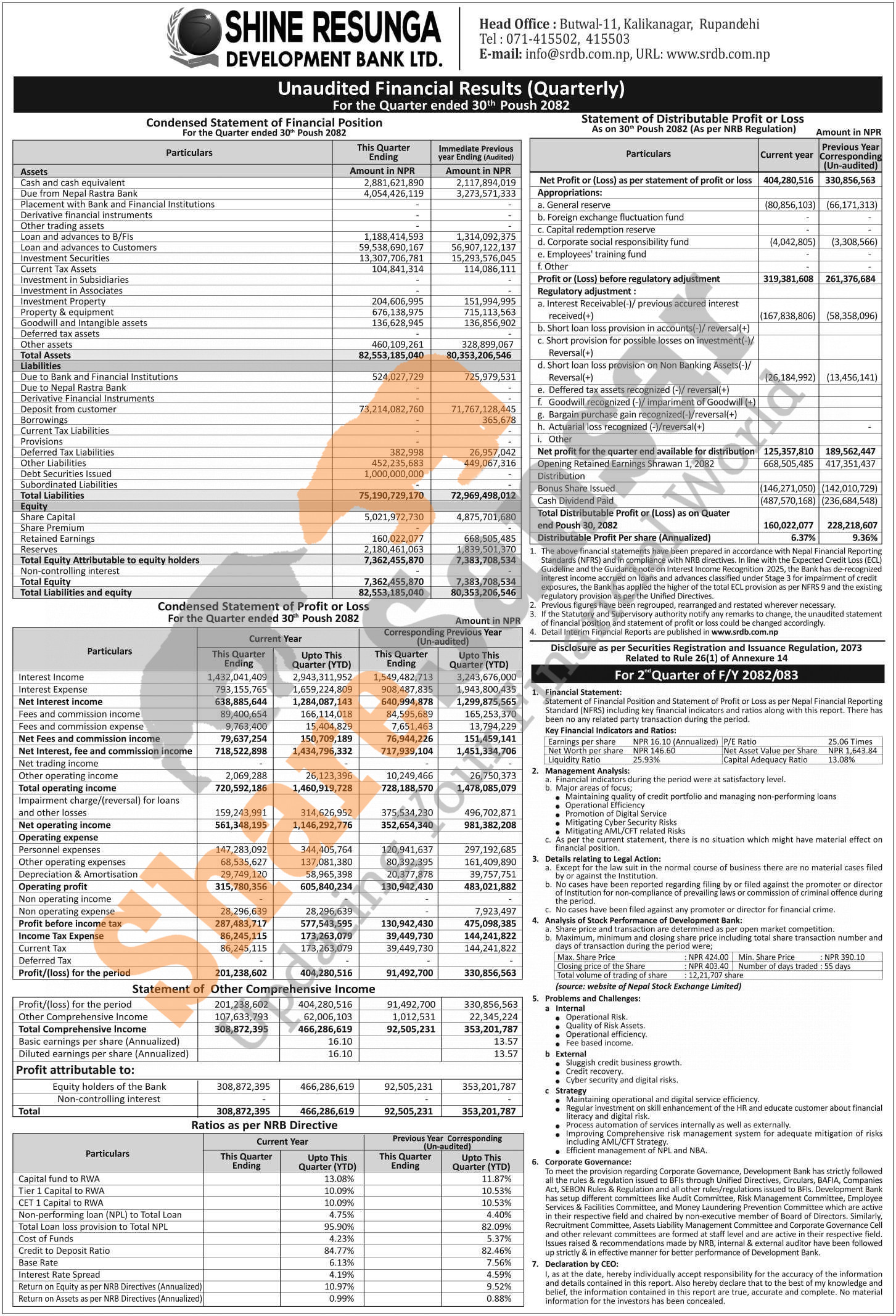 Shine Resunga Development Bank Limited has posted a net profit of Rs 404.28 million and published its 2nd quarter company analysis of the fiscal year 2082/83.