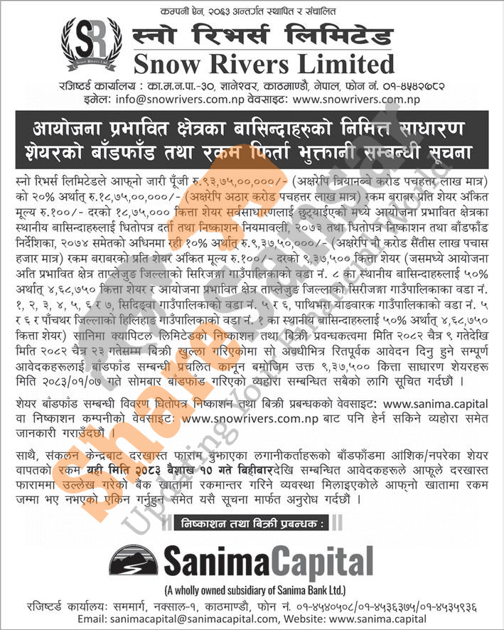 Snow Rivers Limited has allotted its 9,37,500 units IPO shares to the project-affected locals of Taplejung and Panchthar District on 7th Baisakh, 2083.