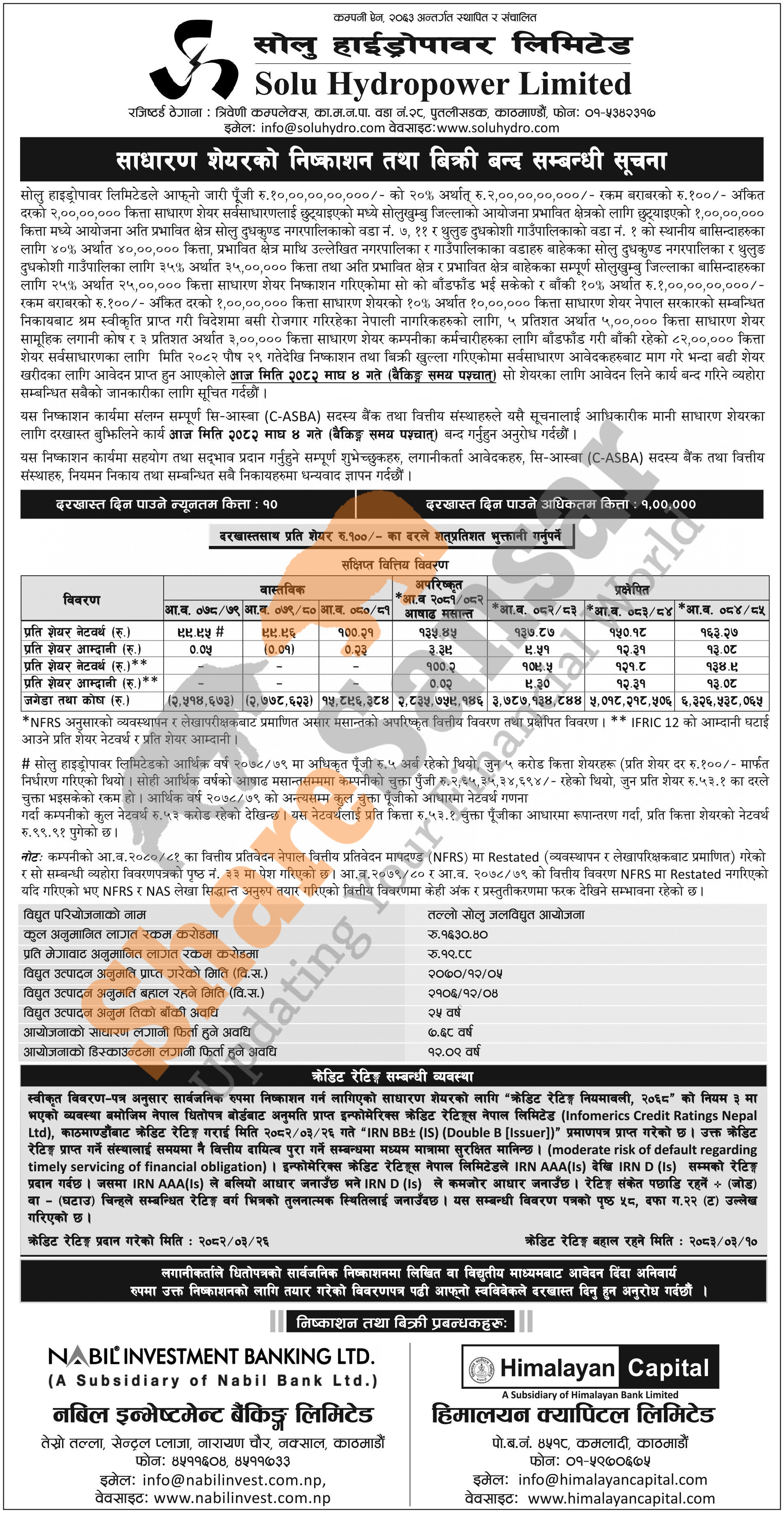 Solu Hydropower Limited is closing its 82,00,000 units IPO shares to the general public from today (4th Magh, 2082).