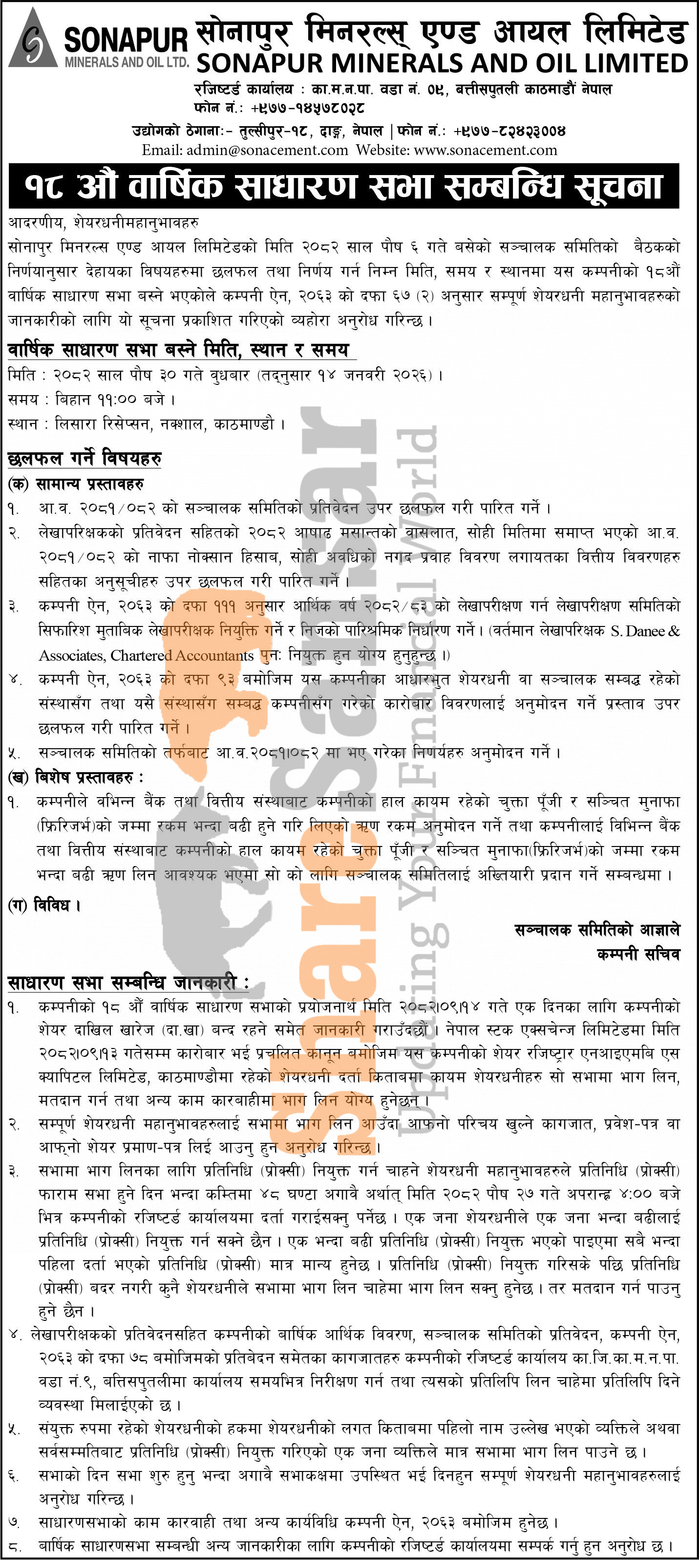 Sonapur Minerals and Oil Limited has announced its 18th AGM going to be held on 30th Poush, 2082.