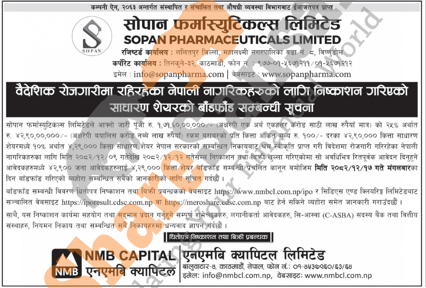 Sopan Pharmaceuticals Limited has published an offer letter to issue 34,74,900 units IPO shares to the general public from 2nd Baisakh to 6th Baisakh, 2083.