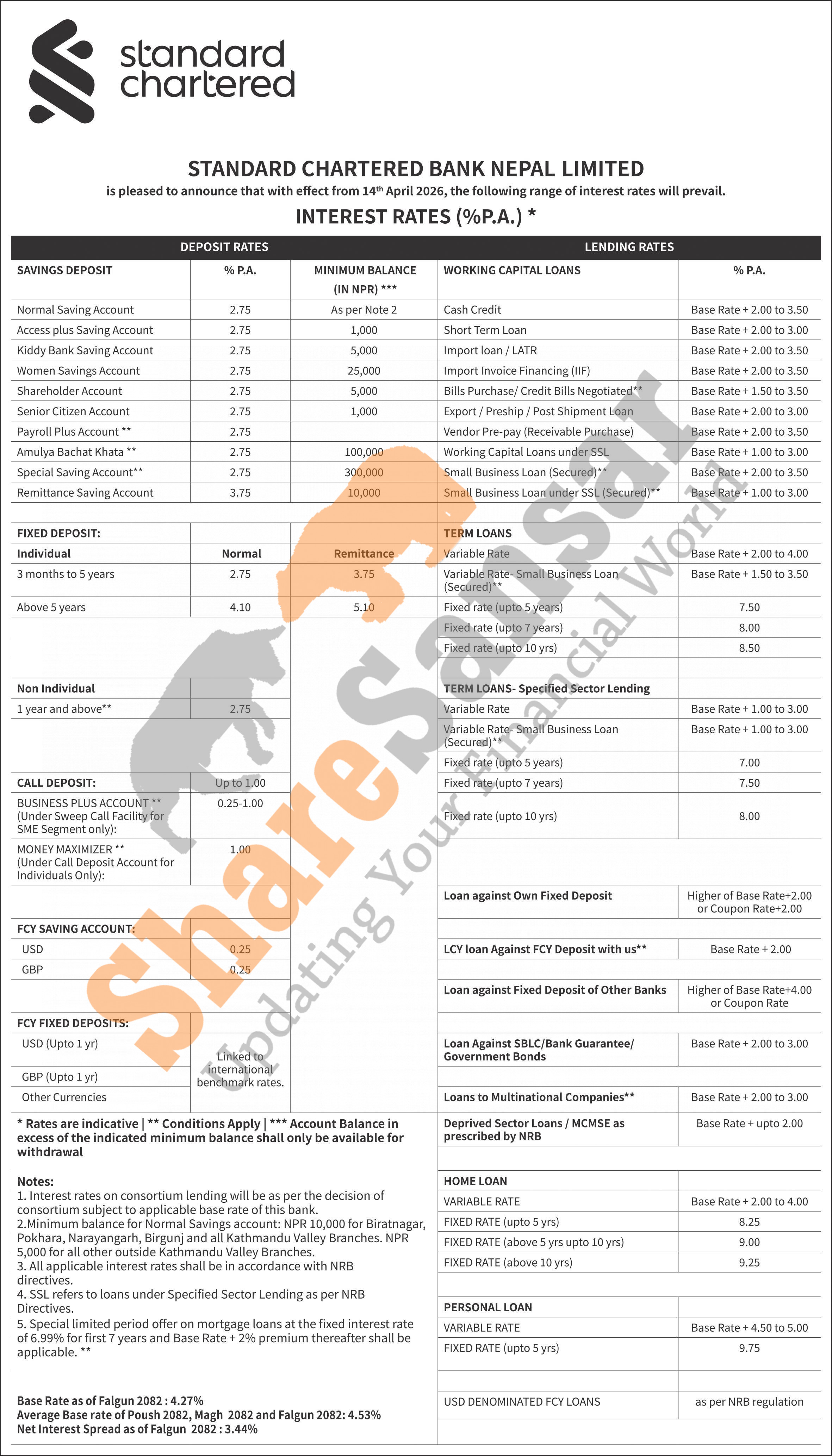 Standard Chartered Bank Nepal Limited has published a notice regarding the new interest rate for deposit and loan products and it's effective from 1st Baisakh, 2083.
