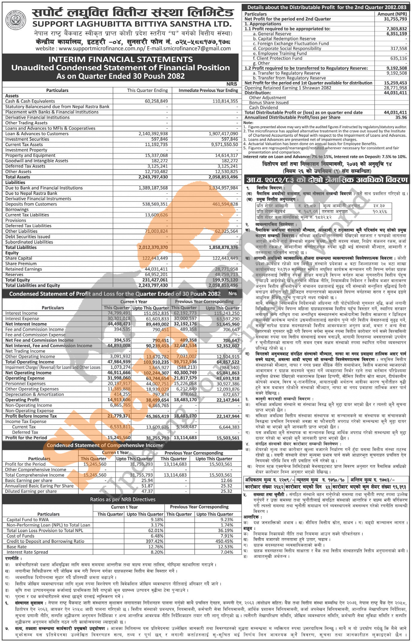 Support Laghubitta Bittiya Sanstha Limited has posted a net profit of Rs 31.75 million and published its 2nd quarter company analysis of the fiscal year 2082/83.