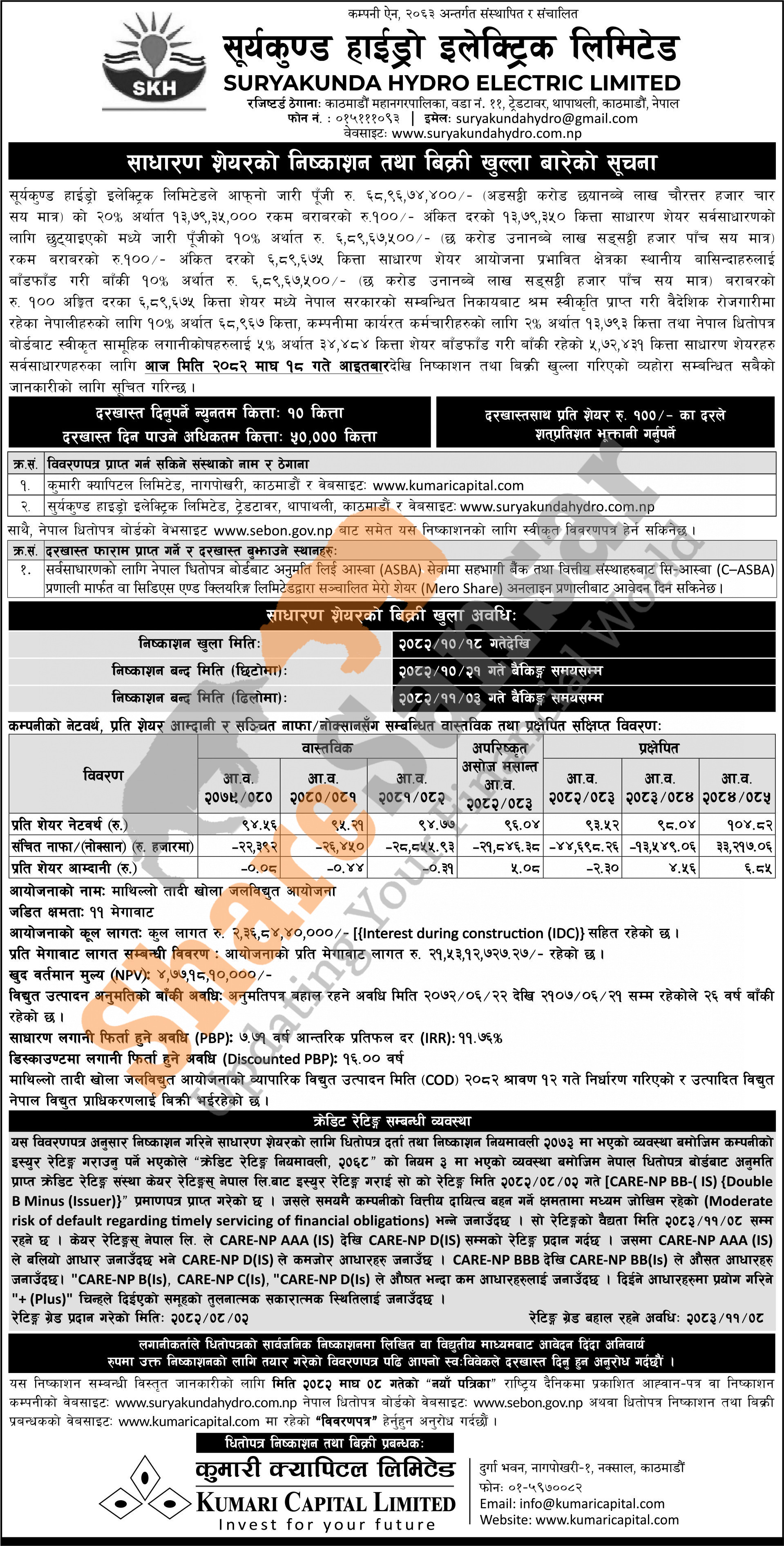 Suryakunda Hydro Electric Limited is opening its 5,72,431 units IPO shares to the general public from today (18th Magh, 2082).