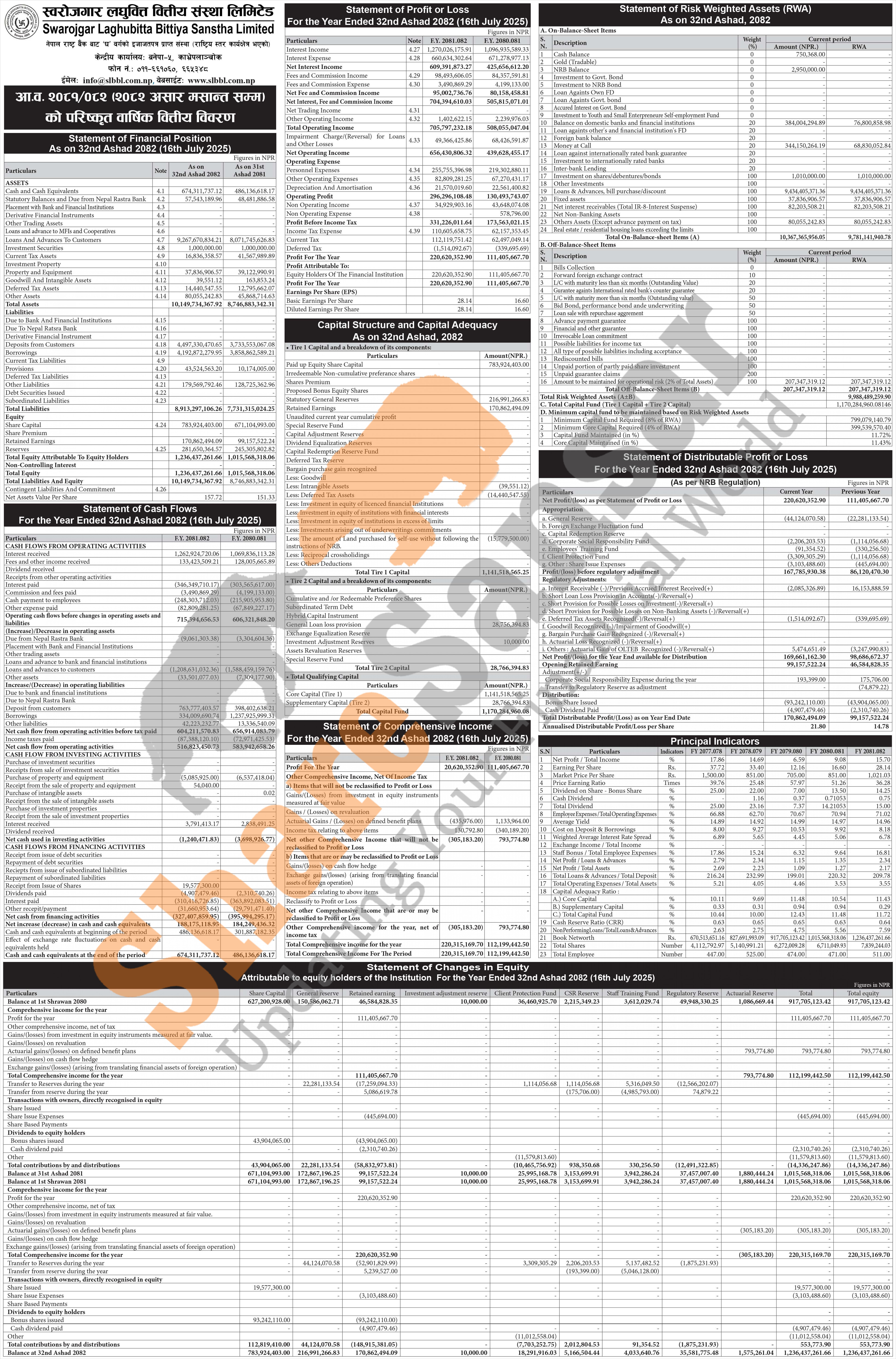 Swarojgar Laghubitta Bittiya Sanstha Limited has published its annual financial statement of the fiscal year 2081/82.