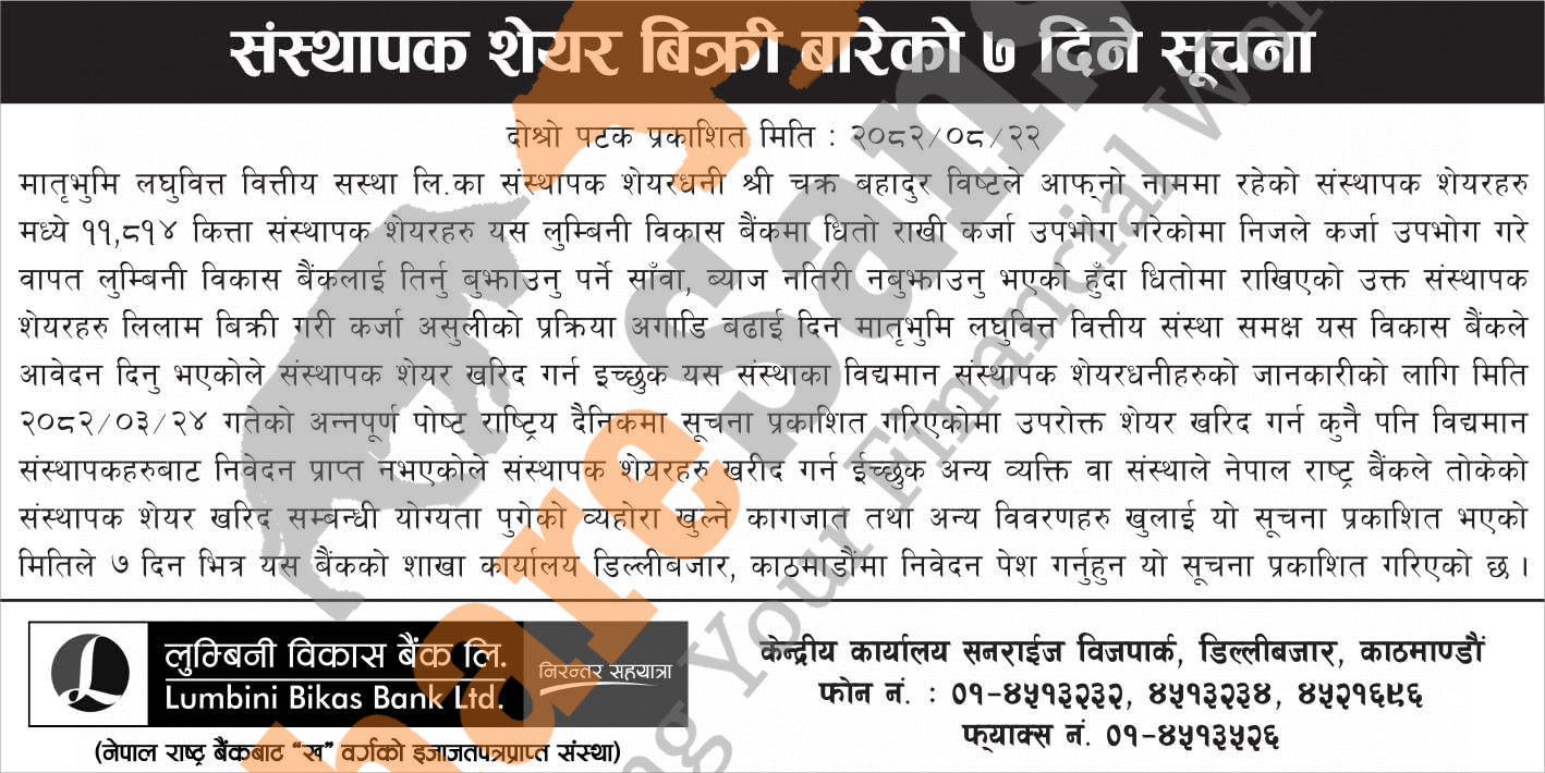 The existing promoter of Lumbini Bikas Bank Limited is selling 11,814 shares to the interested general public/institutions.