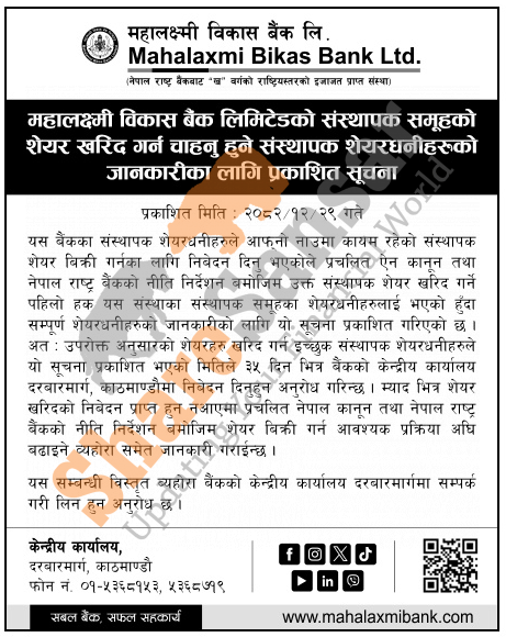 The existing promoter of Mahalaxmi Bikas Bank Limited is selling shares to its promoter shareholders.