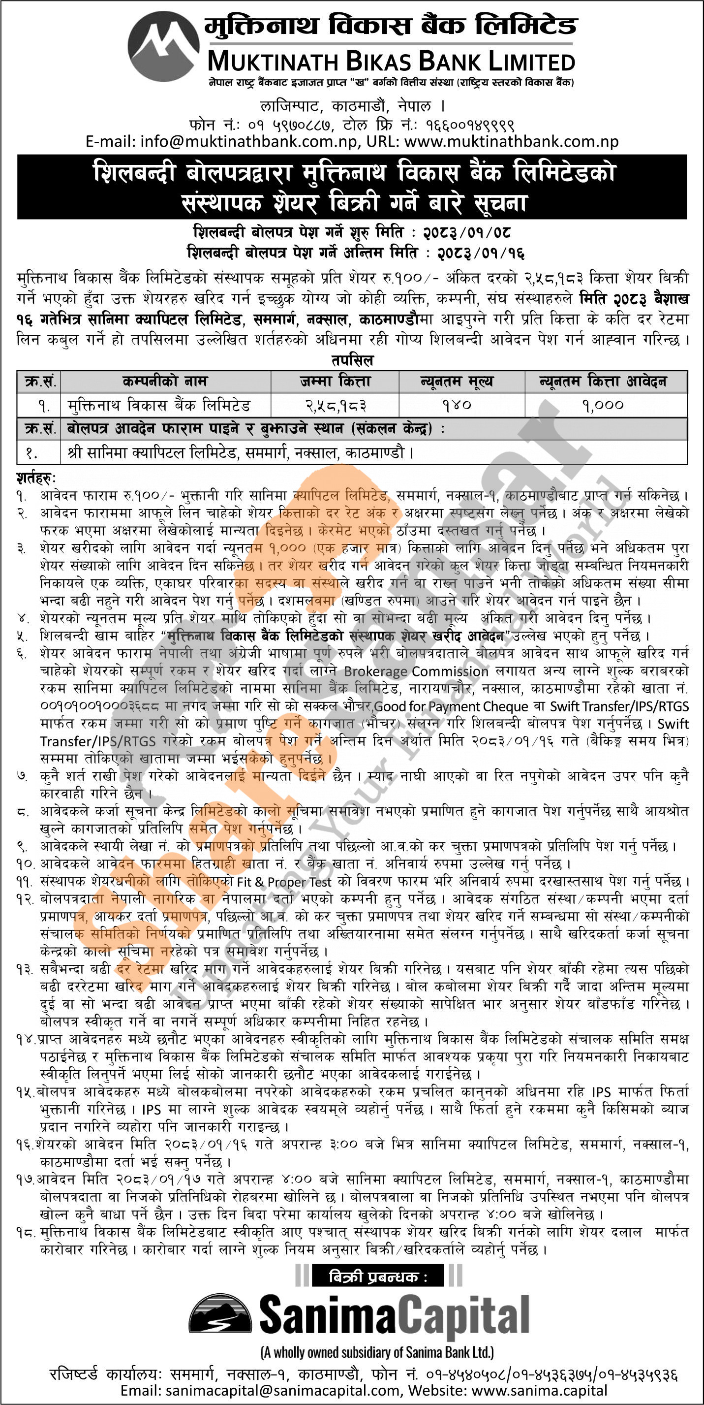 The existing promoter of Muktinath Bikas Bank Limited is selling its 2,58,183 units promoter share in an auction to the interested person/company/institutions from 8th Baisakh to 16th Baisakh, 2083.