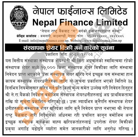 The existing promoter of Nepal Finance Limited is selling 10,000 shares to its promoter shareholders.