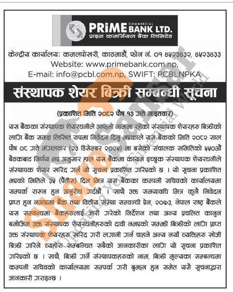 The existing promoter of Prime Commercial Bank Limited is selling shares to its promoter shareholders.