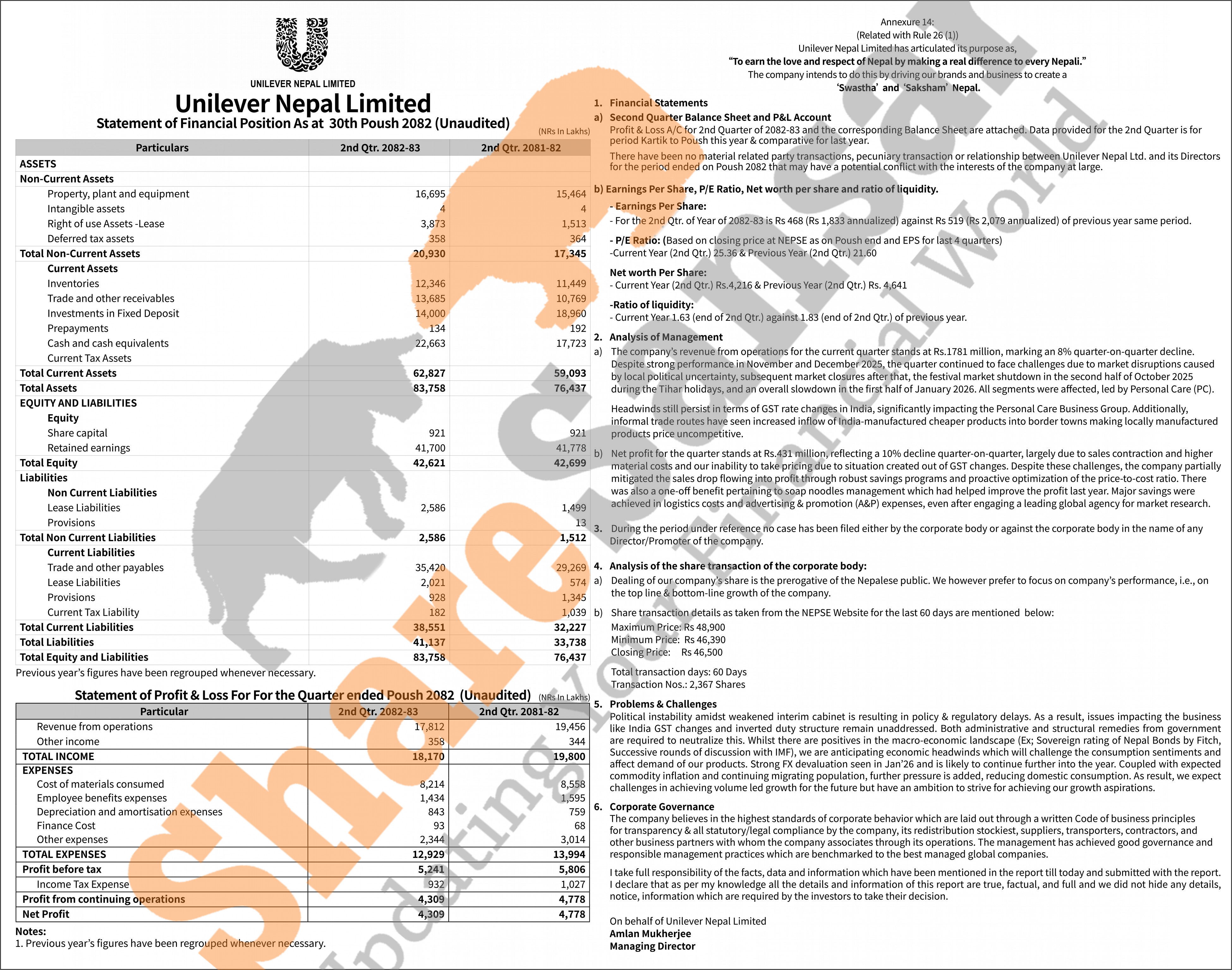 Unilever Nepal Limited has posted a net profit of Rs 430.9 million and published its 2nd quarter company analysis of the fiscal year 2082/83.