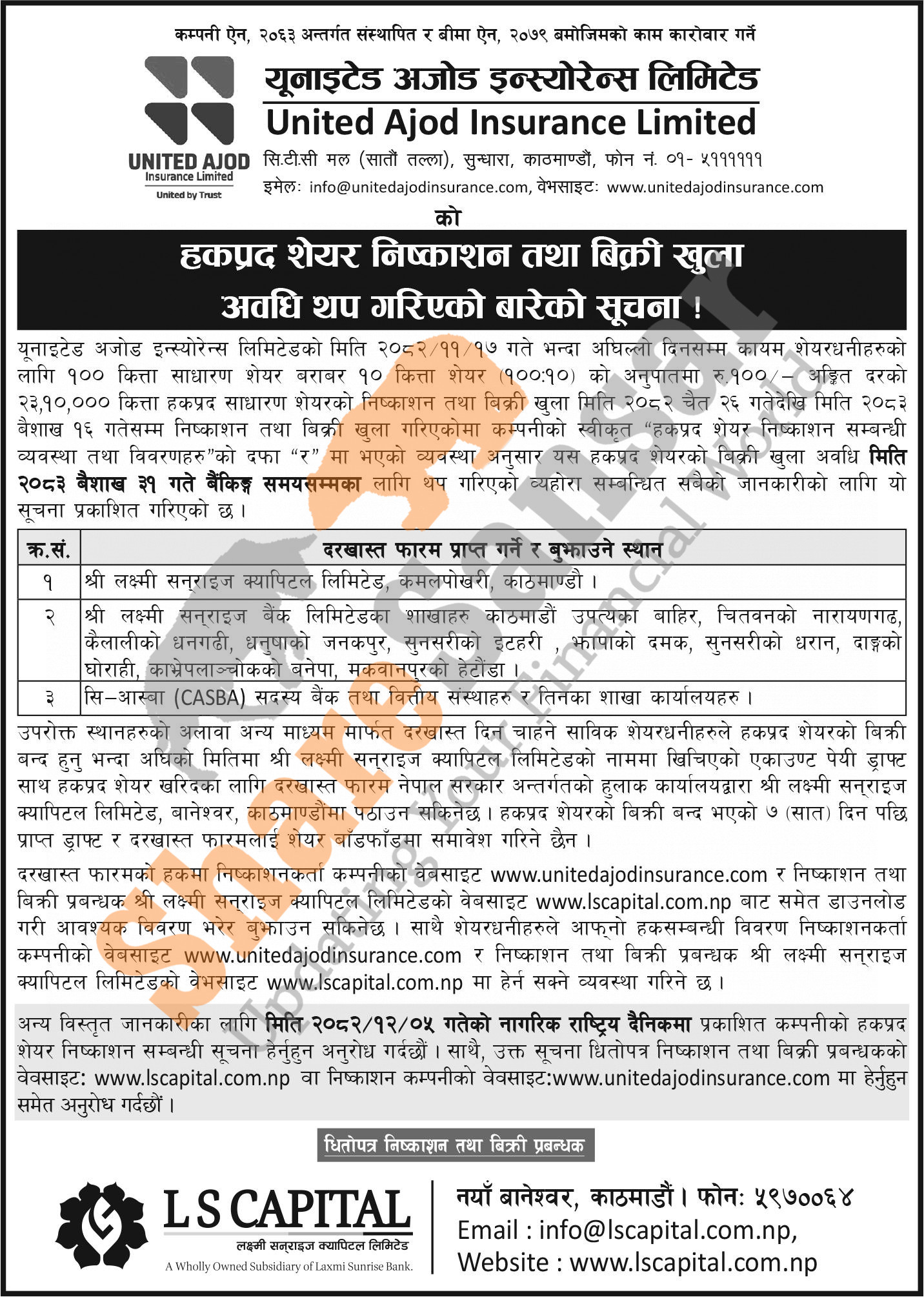 United Ajod Insurance Limited has extended its 100:10 ratio 23,10,000 units right share to its shareholders till 31st Baisakh, 2083.