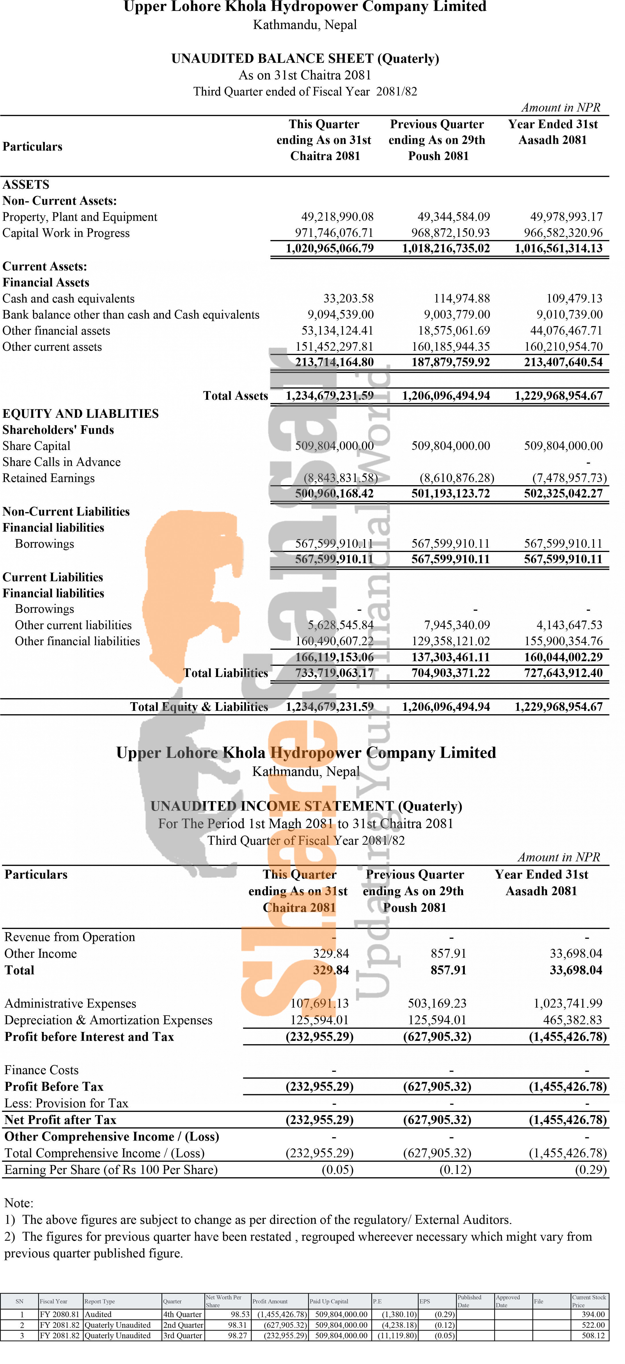 Upper Lohore Khola Hydropower Company Limited has posted a net loss of Rs 0.23 million and published its 3rd quarter company analysis of the fiscal year 2081/82.