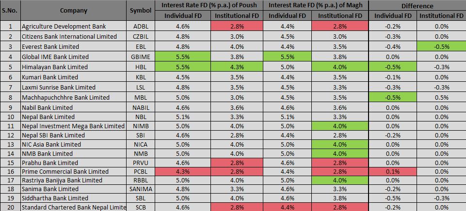Himalayan Bank and Macchapuchre Bank recorded the steepest reductions, each lowering the rates on individual fixed deposits by 0.5 percentage points. Meanwhile Global Ime Bank, Nabil Bank, Nepal Investment Mega Bank, Nepal Bank, NIC Asia Bank, NMB Bank, Prabhu Bank, Rastriya Banjiya Bank and Prime Commercial Bank have maintained the same rates as in Poush.