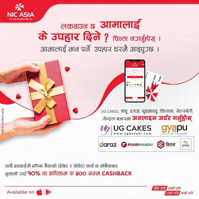 NIC ASIA Bank has launched an attractive cashback offer for its customers under which the bank’s mobile banking as well as Debit / credit card users will receive 10% or upto Rs 500 cashback while purchasing different gifts and cakes during an occasion of Mothers’ Day on Baisakh 11, 2077.