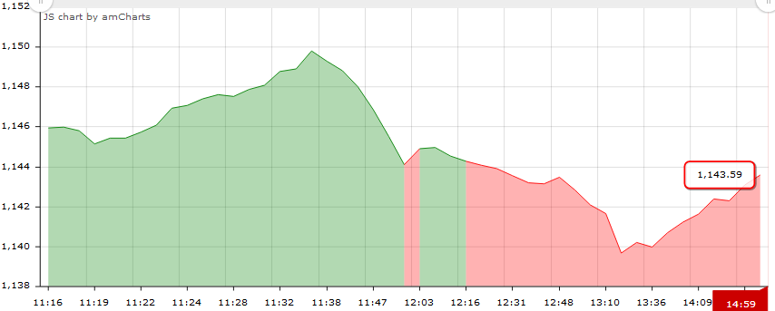 Market drops from high of 1150 point to close at 1143.59 points today; Bank of Kathmandu Limited dominates trade while Universal Power continues to lose