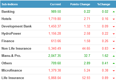 Banking, Manufacturing & Processing and Other were the only sub-indices that ended in the green zone today after gaining 0.02%, 1.62% and 0.41% respectively. Rest of the sub-indices ended in the red zone with Life Insurance sector losing the most at 0.89% or 52.93 points.
