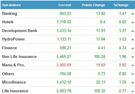 Today’s highest turnover was achieved by Nepal Life Insurance Company (NLIC) at Rs.1.98 Crore. The LTP of the Life Insurance Company stands at Rs.1111 per share. Shares of Nepal Credit and Commerce Bank (NCCB) exchanged the most number of hands today after 61,638 units of the scrip were traded. The LTP of the commercial bank stands at Rs.209 per share.
