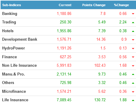 Trading, Hotels, Manufacturing, Others and Life Insurance were among the gaining sectors while rest of the sub-indices ended in the red zone after losing points.