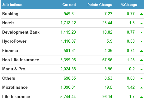 All the sub-indices gained points today and closed in the green zone. Life Insurance sector gained the most at 1.70% followed by Hotels which gained 1.50%.