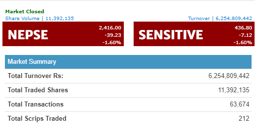 The NEPSE index lost 39.23 points today and closed at 2,416.00. The index opened at 2,406.73 and briefly made an intraday high at 2,428.88. The index lost in intraday action today, going as low as 2,391.4. With this, total volatility of 37.48 points was observed in the trading session today.