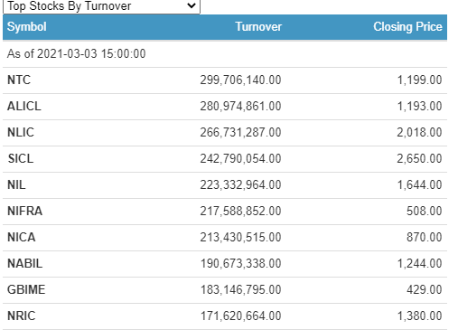 Nepal Doorsanchar Company Limited (NTC) has the highest individual scrip turnover of a little over Rs. 29.97 crores. The shares of Nepal Credit & Commerce Bank Limited Promoter Share (NCCBPO) traded the most.