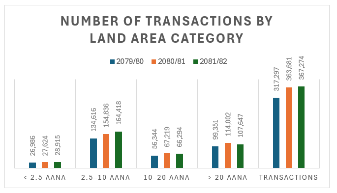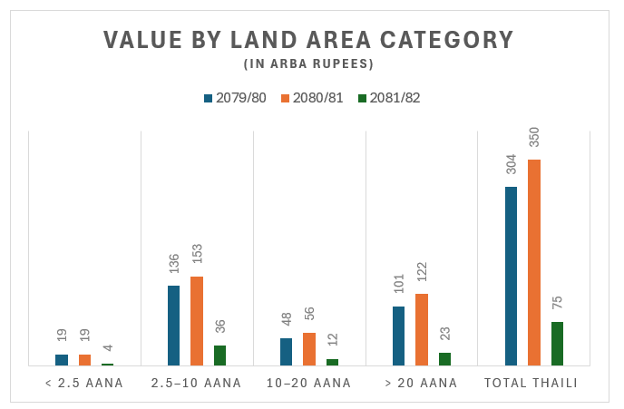 This indicates that larger land parcels, though fewer in number, carry significantly higher transaction values, reflecting their importance in commercial use, institutional investment, and long-term asset holding. The 10–20 aana category also contributes substantially to total value, reinforcing its role as a bridge between individual residential demand and larger-scale investment.