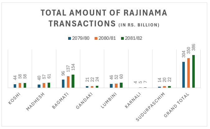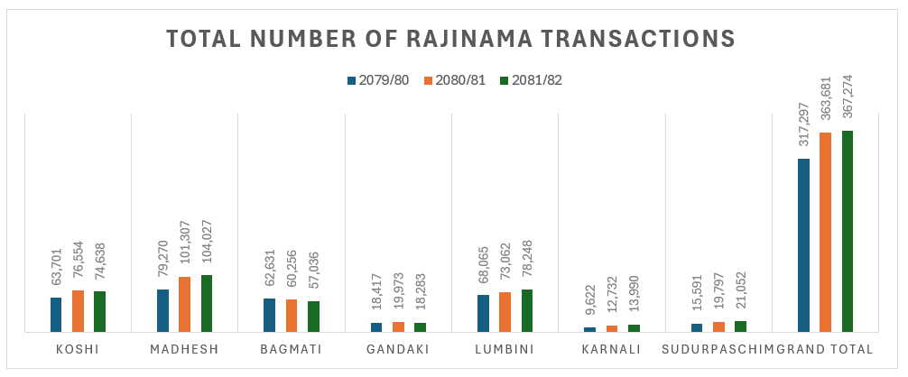 Overall, the numbers clearly indicate that over 60% of Nepal’s Rajinama transactions are concentrated in just two provinces Bagmati and Madhesh. In contrast, the remaining five provinces share less than 40%, reflecting strong geographic concentration, uneven economic development, and disparities in land market activity across the country.